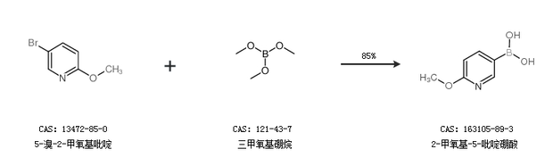 2.通过5-溴-2-甲氧基吡啶和三甲氧基硼烷合成2-甲氧基-5-吡啶硼酸,收率约85%;