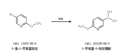 1.通过5-溴-2-甲氧基吡啶合成2-甲氧基-5-吡啶硼酸,收率约89%;