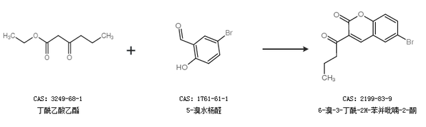 1.通过丁酰乙酸乙酯和5-溴水杨醛合成6-溴-3-丁酰-2H-苯并吡喃-2-酮