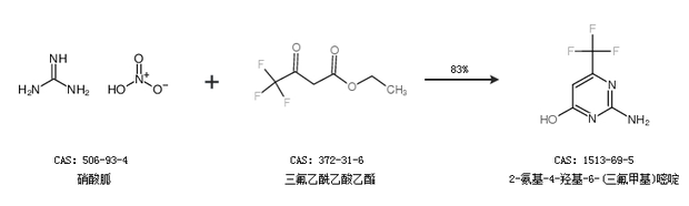 1.通过硝酸胍和三氟乙酰乙酸乙酯合成2-氨基-4-羟基-6-(三氟甲基)嘧啶,收率约83%;