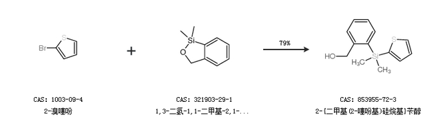 1.通过2-溴噻吩和1,3-二氢-1,1-二甲基-2,1-苯并氧硅杂环戊二烯合成2-{二甲基(2-噻吩基)硅烷基}苄醇,收率约79%;