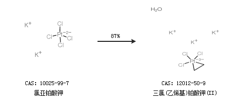 1.通过氯亚铂酸钾合成三氯(乙烯基)铂酸钾(II),收率约87%;