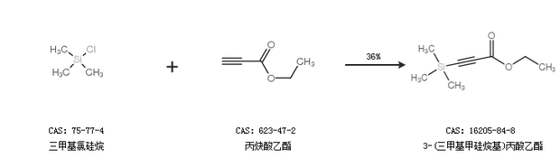1.通过三甲基氯硅烷和丙炔酸乙酯合成3-(三甲基甲硅烷基)丙酸乙酯,收率约36%;