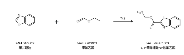 1.通过苯并噻唑和甲酸乙酯合成1,3-苯并噻唑-2-羧酸乙酯,收率约74%;