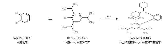 2.通过2-溴氯苯和1-溴-2,4,6-三异丙苯合成2-二环己基磷-2,4,6-三异丙基联苯,收率约84%;