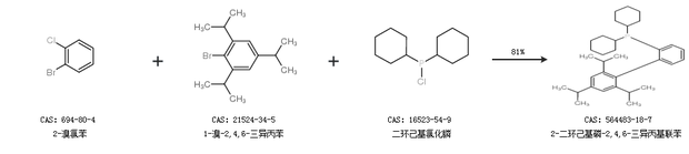 1.通过2-溴氯苯、1-溴-2,4,6-三异丙苯和二环己基氯化膦合成2-二环己基磷-2,4,6-三异丙基联苯,收率约81%;