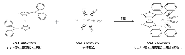 2.通过1,1''-双(二苯基膦)二茂铁和六羰基钨合成(1,1’-双(二苯基磷)二茂铁)四羰基钨,收率约77%;