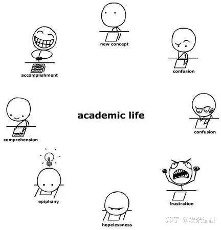 这张图是不是就像你学术生活中的几种状态,面对新概念(new concept),从困惑(confusion)到受挫懊恼(frustration),从崩溃绝望(hopelessness)再到灵感迸发(epiphany),最后理解(comprehension),圆满完成,获得成就感(accomplishment),再面对新课题走进下一个情绪的循环。