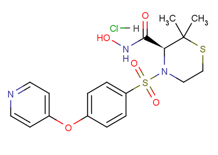 Prinomastat hydrochloride 也称为: AG3340 hydrochloride; KB-R9896 hydrochloride。Prinomastat hydrochloride (AG3340 hydrochloride) 是一种广谱,有效的口服活性金属蛋白酶 (MMP) 抑制剂,对于 MMP-1, MMP-3 和 MMP-9 的 IC50 分别为 79 nM,6.3 nM 和 5.0 nM。Prinomastat hydrochloride 抑制 MMP-2, MMP-3 和 MMP-9 的 Ki 分别为 0.05 nM,0.3 nM 和 0.26 nM。Prinomastat hydrochloride 可穿过血脑屏障。抗肿瘤活性。