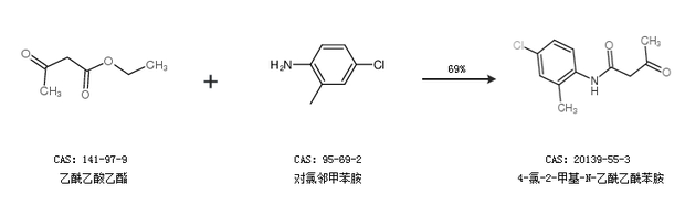 1.通过乙酰乙酸乙酯和对氯邻甲苯胺合成4-氯-2-甲基-N-乙酰乙酰苯胺,收率约69%;