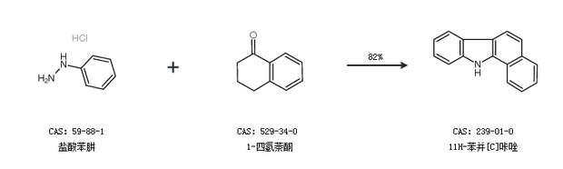 1.通过盐酸苯肼和1-四氢萘酮合成11H-苯并[C]咔唑,收率约82%;