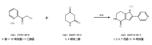 1.通过2-溴-1-(2-吡啶基)-1-乙酮氢溴酸和2,4-哌啶二酮合成1,5,6,7-四氢-2-(4-吡啶基)-4H-吡咯并[3,2-C]吡啶-4-酮,收率约41%;