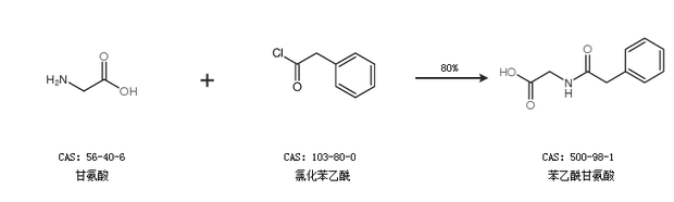 1.通过甘氨酸和氯化苯乙酰合成苯乙酰甘氨酸,收率约80%;