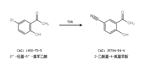 2.通过2′-羟基-5′-溴苯乙酮合成2-乙酰基-4-氰基苯酚,收率约70%;