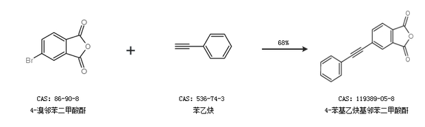 2.通过4-溴邻苯二甲酸酐和苯乙炔合成4-苯基乙炔基邻苯二甲酸酐,收率约68%;