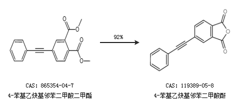 1.通过4-苯基乙炔基邻苯二甲酸二甲酯合成4-苯基乙炔基邻苯二甲酸酐,收率约92%;
