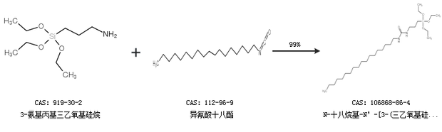 1.通过3-氨基丙基三乙氧基硅烷和异氰酸十八酯合成N-十八烷基-N’-[3-(三乙氧基硅烷)丙基]脲,收率约99%;