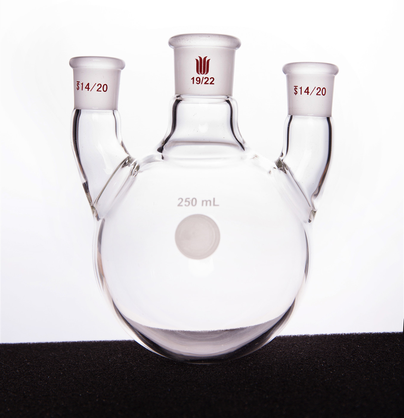 直三口球瓶,厚壁高强度,中间磨口:19/22,侧磨口:14/20,250ml