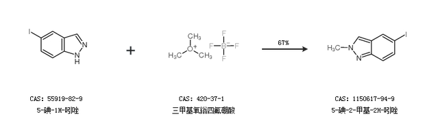 1.通过5-碘-1H-吲唑和三甲基氧鎓四氟硼酸合成5-碘-2-甲基-2H-吲唑,收率约67%;