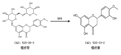 1.通过橙皮苷合成橙皮素,收率约98%;