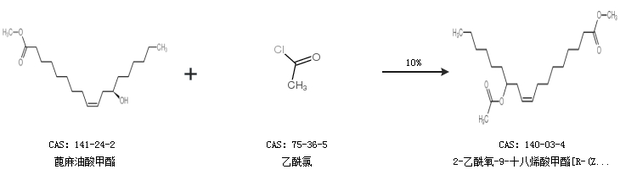 1.通过蓖麻油酸甲酯和乙酰氯合成2-乙酰氧-9-十八烯酸甲酯[R-(Z)-,收率约10%;