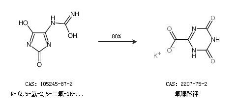 1.通过N-(2,5-氢-2,5-二氧-1H-咪唑-4-烷基)-脲合成氧嗪酸钾,收率约80%;