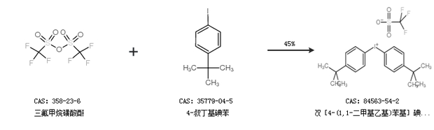 2.通过三氟甲烷磺酸酐和4-叔丁基碘苯合成双[4-(1,1-二甲基乙基)苯基]碘鎓与三氟甲磺酸的盐,收率约45%;